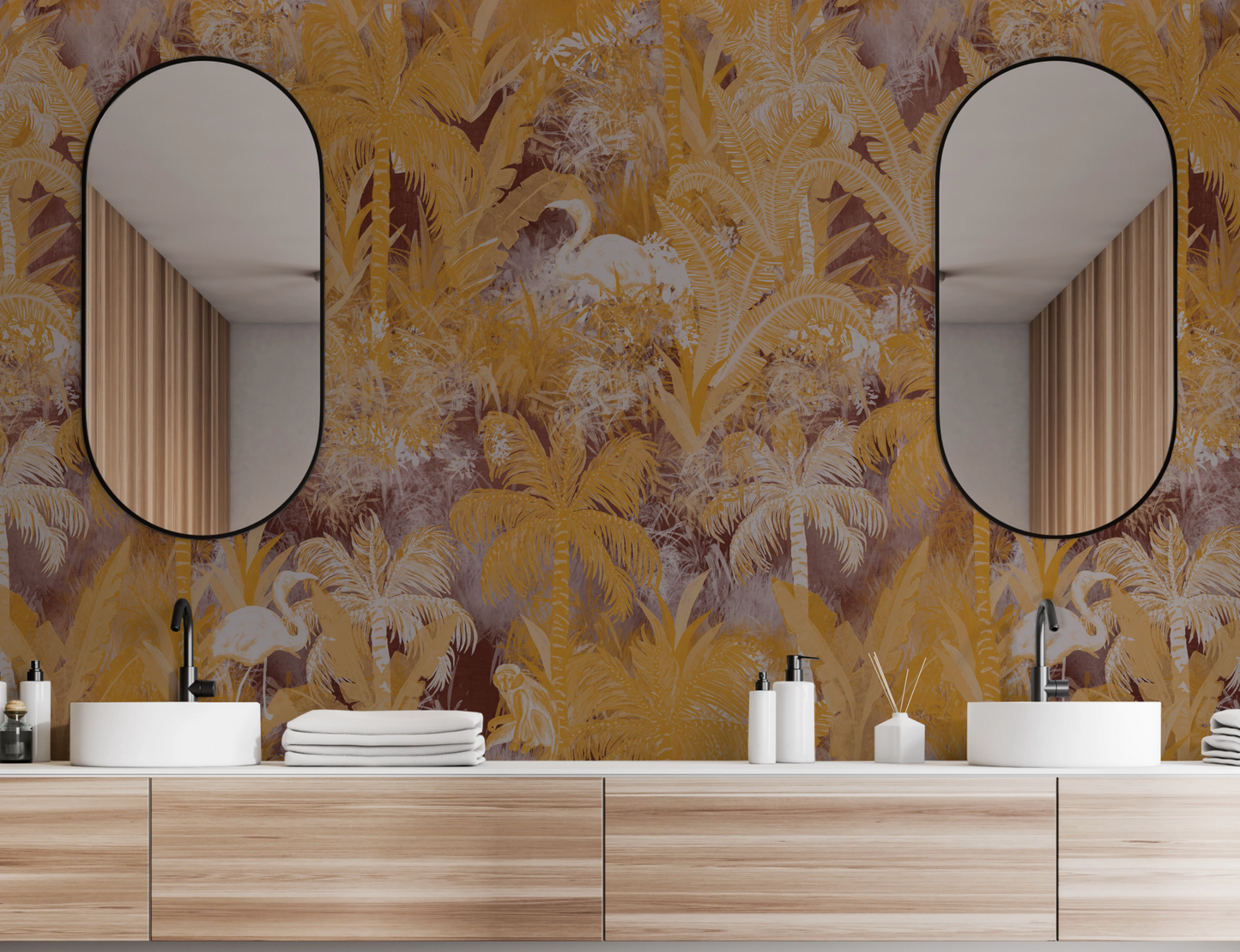 tep into a realm of tropical luxury with our mesmerizing Jungle Wallpaper, meticulously hand-painted to infuse your living spaces with the vibrant energy of exotic flora and fauna. Featuring rich mustard yellow and burgundy tones, this captivating wallpaper evokes a sense of opulence and warmth, transporting you to a lush jungle paradise right in the comfort of your own home. Let the exotic vibes and vibrant colors breathe new life into your living spaces, creating a captivating ambiance that enchants the senses and elevates your home decor to new heights.